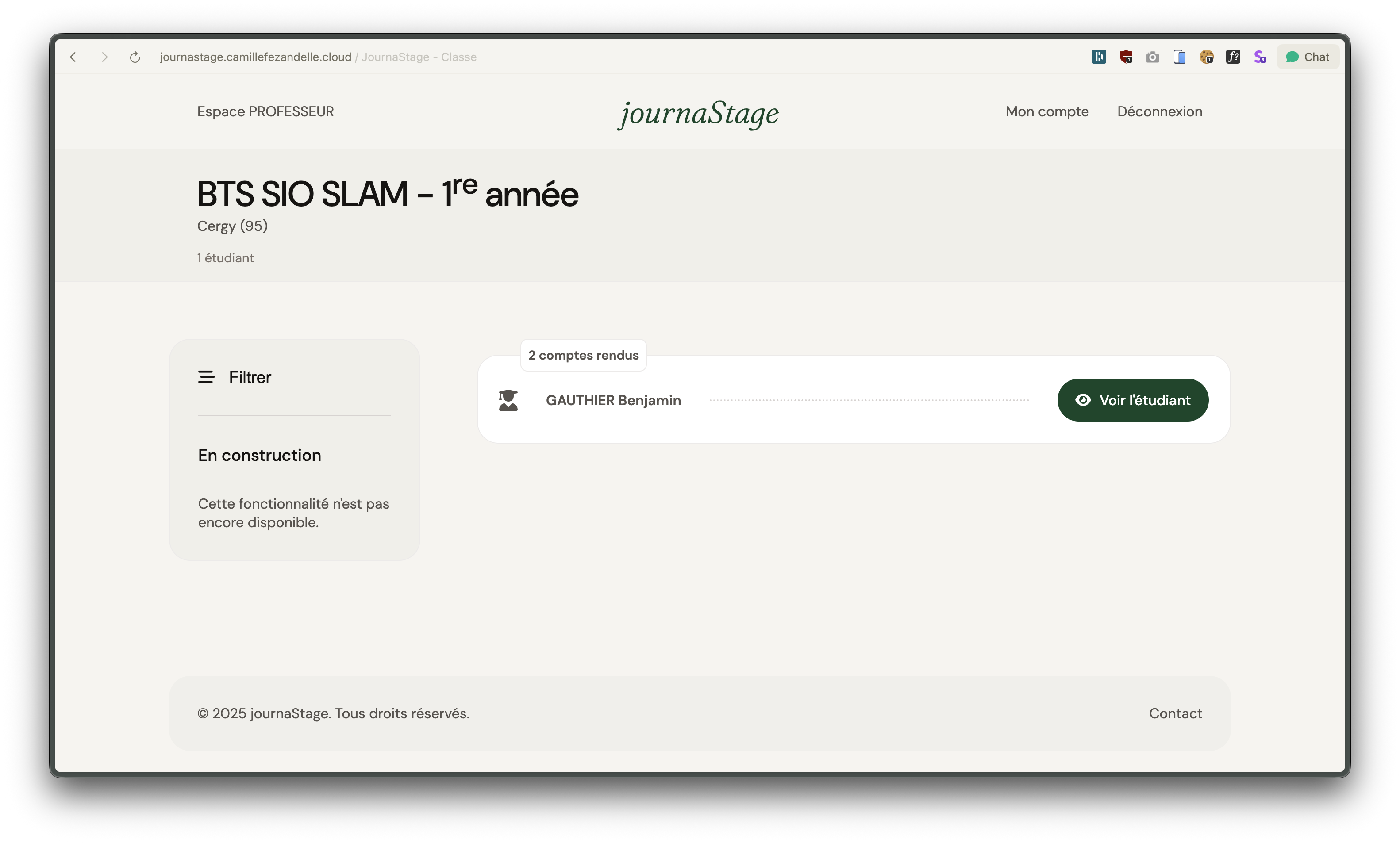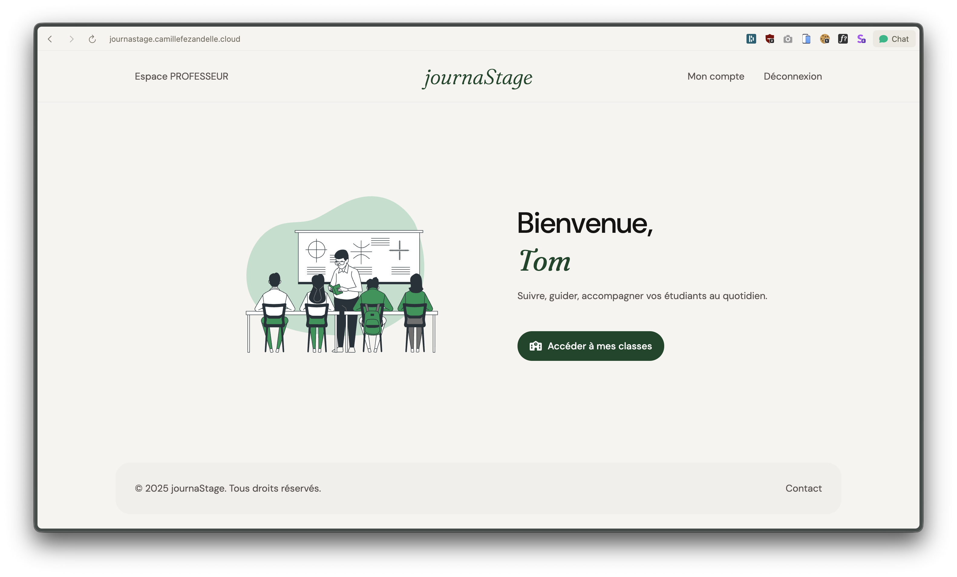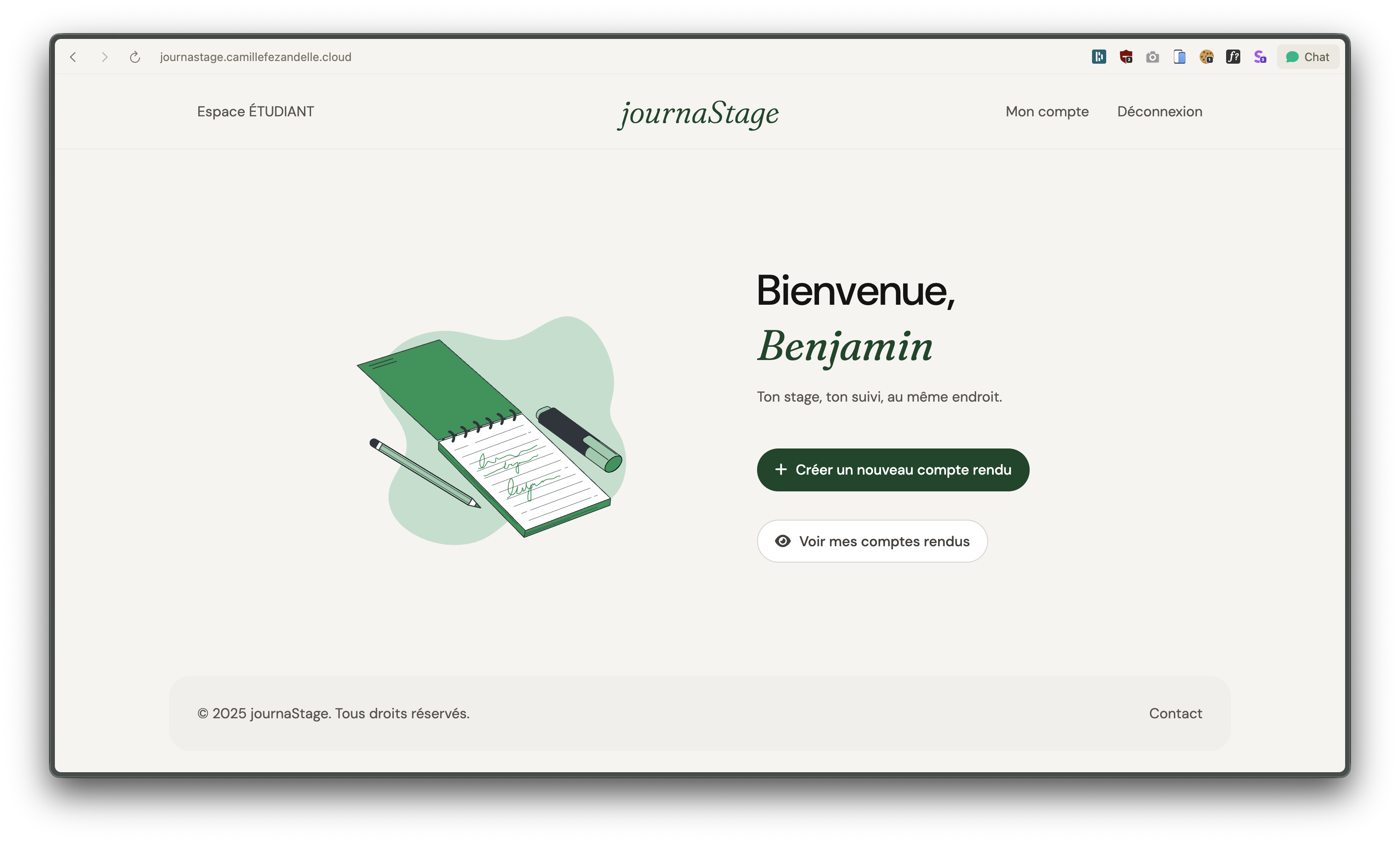 JournaStage est une plateforme web en PHP destinée à faciliter la rédaction et le suivi des comptes rendus entre étudiants et enseignants. Elle offre une interface simple, moderne et sécurisée pour centraliser tout le processus.