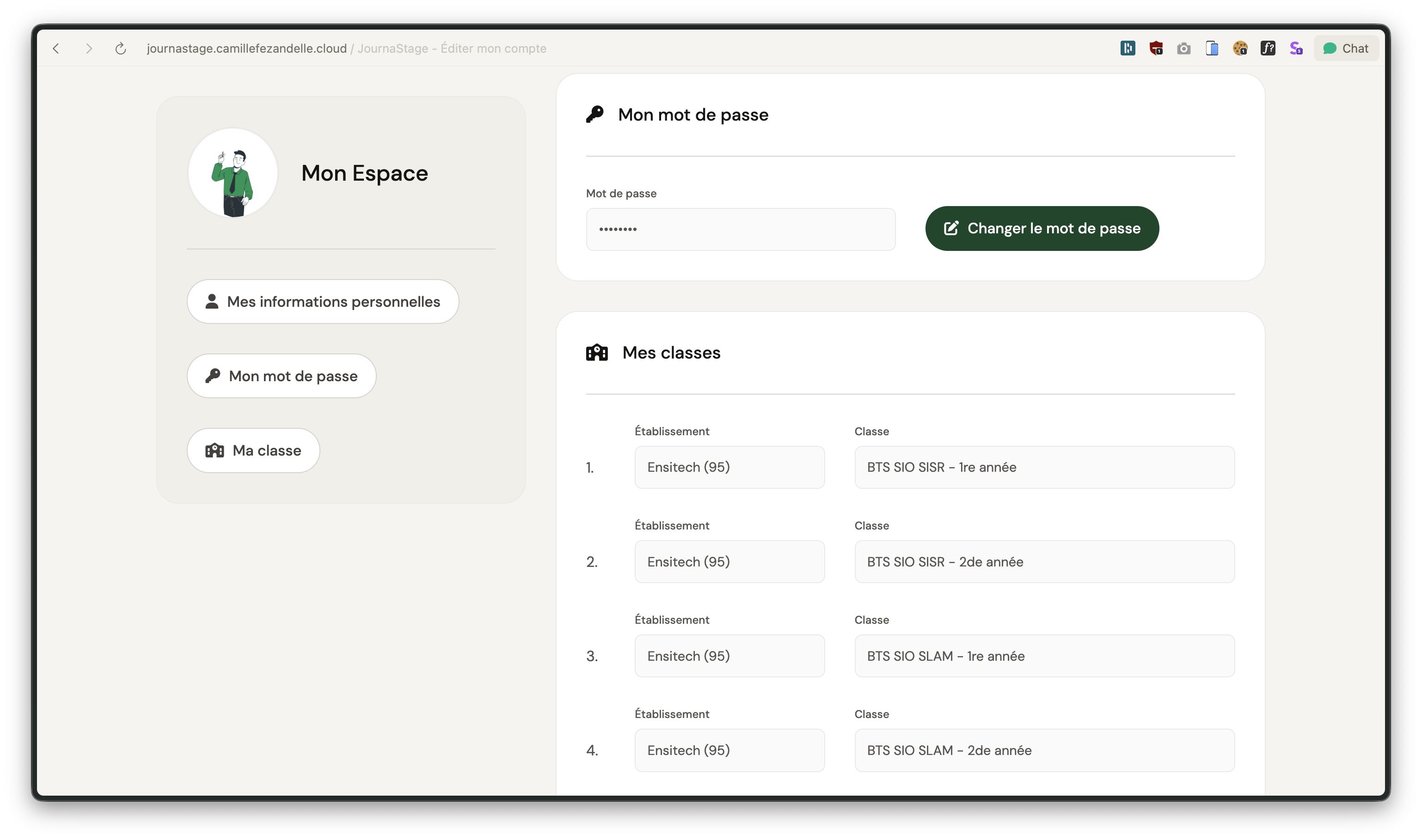 - mot de passe : Password123=La base de données JournaStage s’appuie sur un modèle relationnel garantissant la cohérence des liens entre les utilisateurs, les comptes rendus, les classes et les établissements.